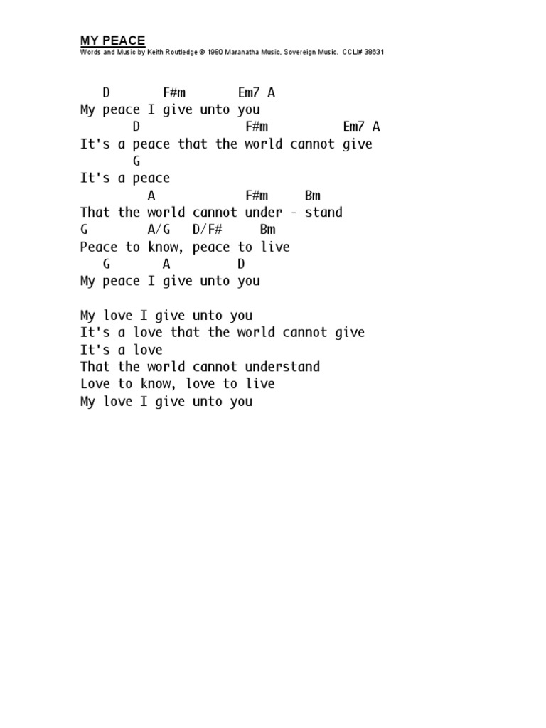 My Peace 34 C Am7 F G My peace I give unto you G Am7 F G2 Its a peace that the world cannot give F Dm7 Em Asus A7 Its a peace that the world cannot understand Dm7 G Em7 Am Peace to know peace to live Dm7 G F G My peace I give unto you. Fresh tabs top tabs lessons submit videos. Verse 1 C Em Dm G My peace I give unto you C Em Dm G Its a peace that the world cannot give F Dm7 Em Am A7 Its a peace that the world cannot understand Dm G Em Am Peace to know peace to live Dm G F C My peace I give unto you Verse 2 C Em Dm G My love I give unto you C Em Dm G Its a love that the world cannot give F Dm7 Em Am A7 Its a.